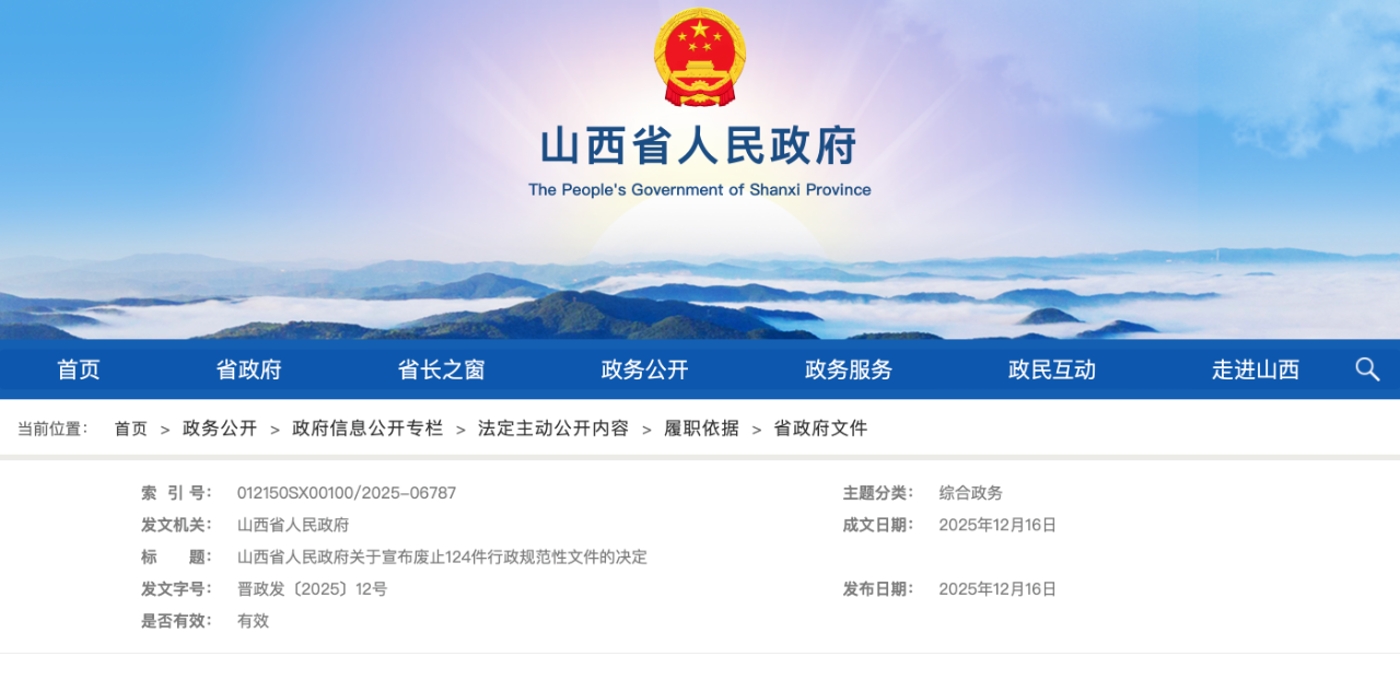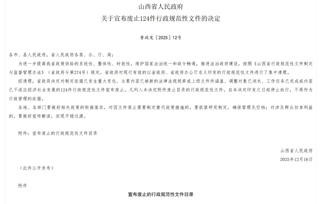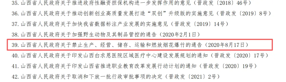 12月16日,《山西省人民政府關(guān)于宣布廢止124件行政規(guī)范性文件的決定》公布,其中,2020年8月17日發(fā)布、同年10月1日起正式實施的《山西省人民政府關(guān)于禁止生產(chǎn)、經(jīng)營、儲存、運輸和燃放煙花爆竹的通告》被納入廢止目錄,該通告自12月16日起停止執(zhí)行,不再作為行政管理依據(jù)。