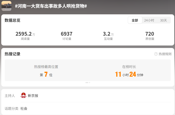 截至12月29日14時(shí),全網(wǎng)相關(guān)信息1.2萬(wàn)余條,“#河南一大貨車(chē)出事故多人哄搶貨物#”“#警方介入貨車(chē)出事故貨物遭哄搶#”“#貨車(chē)事故貨物被哄搶司機(jī)嘶吼別搶了#” 等相關(guān)微博話題閱讀量累計(jì)超3500萬(wàn)。
