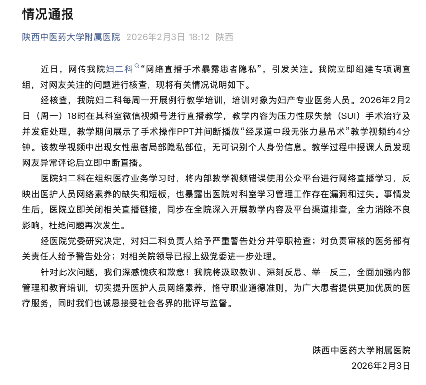我院婦二科每周一開(kāi)展例行教學(xué)培訓(xùn),培訓(xùn)對(duì)象為婦產(chǎn)專業(yè)醫(yī)務(wù)人員。2月2日18時(shí)其科室微信視頻號(hào)進(jìn)行直播教學(xué),視頻中出現(xiàn)女性患者局部隱私部位,無(wú)可識(shí)別個(gè)人身份信息。教學(xué)過(guò)程中授課人員發(fā)現(xiàn)網(wǎng)民異常評(píng)論后立即中斷直播。科室將內(nèi)部教學(xué)視頻用于公眾平臺(tái)直播,暴露醫(yī)護(hù)人員網(wǎng)絡(luò)素養(yǎng)不足及醫(yī)院管理漏洞。醫(yī)院已關(guān)閉直播鏈接、開(kāi)展全院排查,并對(duì)婦二科負(fù)責(zé)人給予嚴(yán)重警告及停職檢查處分,對(duì)醫(yī)務(wù)部相關(guān)責(zé)任人給予警告處分,相關(guān)院領(lǐng)導(dǎo)已報(bào)上級(jí)黨委處理。醫(yī)院對(duì)此深表愧疚歉意,承諾將汲取教訓(xùn)、加強(qiáng)管理,提升醫(yī)護(hù)人員素養(yǎng),誠(chéng)懇接受社會(huì)監(jiān)督。