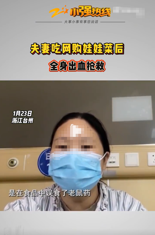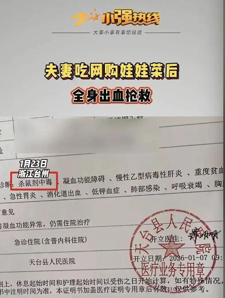 1月23日,浙江衛(wèi)視科教頻道小強(qiáng)熱線節(jié)目報(bào)道稱,浙江臺(tái)州天臺(tái)縣楊女士和丈夫于2025年12月網(wǎng)購?fù)尥薏?,食用后夫婦倆同時(shí)出現(xiàn)全身出血癥狀,入院搶救。醫(yī)院診斷結(jié)果顯示,夫婦倆均為老鼠藥中毒。1月12日,夫婦倆選擇報(bào)警。警方檢測了楊女士家中物品,從娃娃菜中檢測出了老鼠藥。隨后,天臺(tái)縣公安局受理了楊女士夫婦報(bào)稱的“森逸軒花卉園藝生產(chǎn)、銷售有毒、有害食品案”。
