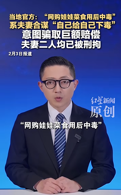 截至2月4日12時(shí),相關(guān)信息達(dá)9.7萬余條,“#夫妻倆吃網(wǎng)購?fù)尥薏酥卸救沓鲅?”“#警方查明夫妻網(wǎng)購?fù)尥薏酥卸径驹?”“#夫妻網(wǎng)購?fù)尥薏耸秤弥卸鞠嫡煞蛳露?”“#警方辟謠夫妻網(wǎng)購?fù)尥薏酥卸鞠嫡煞蛳露?”“#吃娃娃菜中毒夫妻均被刑拘#”等相關(guān)話題閱讀量累計(jì)超過2億。其中“#吃娃娃菜中毒夫妻均被刑拘#”登上熱搜第一位。
