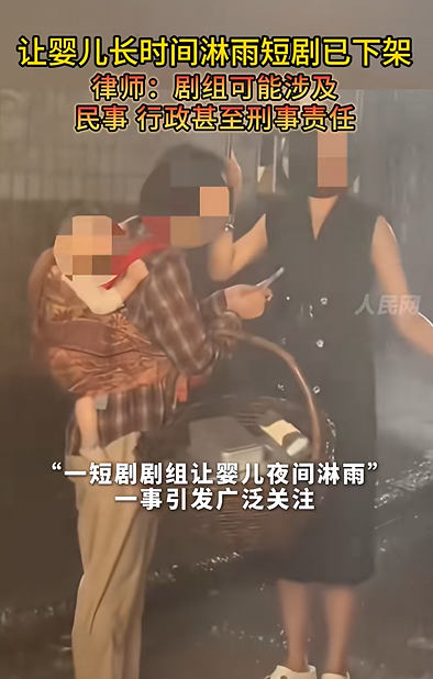 1月17日,短劇女演員邢昀發(fā)文吐槽“短劇劇組讓嬰兒夜間淋雨半小時”,帖文中稱,“夜里拍雨戲特別冷,灑水車那種瓢潑大雨,打傘也難以遮住,孩子被淋了好久,哭得撕心裂肺!”她還透露,拍近景時演員臉上不能有雨,所以傘不能放低,最好的解決辦法是拍主角鏡頭時把孩子換成假孩子,但是劇組為了節(jié)約時間就沒有換。隨后“#嬰兒淋雨拍短劇#”話題登上熱搜榜第2位。據(jù)九派新聞、紅星新聞等媒體跟進(jìn)報(bào)道,該場戲嬰兒的片酬僅800元,部分家長因經(jīng)濟(jì)壓力接受此類拍攝。目前該微短劇已全平臺下架。