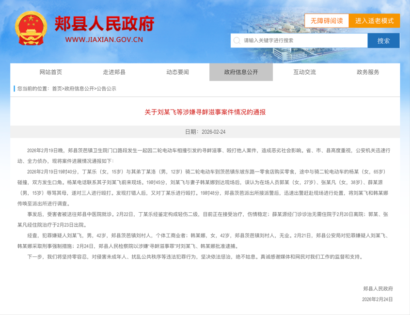 2月24日,平頂山市郟縣人民政府跟進(jìn)發(fā)布詳細(xì)通報(bào),稱劉某飛與妻子韓某娜到達(dá)現(xiàn)場后,誤認(rèn)為在場人員郭某、張某凡、薛某源辱罵其母,遂對(duì)三人進(jìn)行毆打。發(fā)現(xiàn)打錯(cuò)人后,又對(duì)丁某樂進(jìn)行毆打。通報(bào)確認(rèn)被打女孩丁某樂傷情鑒定為輕傷二級(jí),目前正在接受治療,三名勸架路人經(jīng)診治均已離院。經(jīng)查,犯罪嫌疑人劉某飛,男,42歲,郟縣茨芭鎮(zhèn)劉村人,個(gè)體工商業(yè)者;韓某娜,女,42歲,郟縣茨芭鎮(zhèn)劉村人,無業(yè)。24日,郟縣人民檢察院以涉嫌尋釁滋事罪對(duì)劉某飛、韓某娜批準(zhǔn)逮捕。
