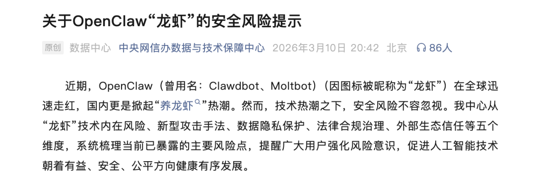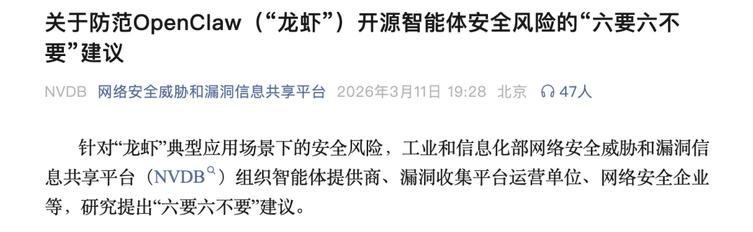 3月10日和11日,中央網(wǎng)信辦、工業(yè)和信息化部先后發(fā)布關(guān)于OpenClaw“龍蝦”的安全風(fēng)險提示,從“龍蝦”技術(shù)內(nèi)在風(fēng)險、新型攻擊手法、數(shù)據(jù)隱私保護(hù)、法律合規(guī)治理、外部生態(tài)信任等維度,系統(tǒng)梳理當(dāng)前已暴露的主要風(fēng)險點(diǎn),并提出“六要六不要”的規(guī)范指引,提醒用戶強(qiáng)化風(fēng)險意識,引導(dǎo)人工智能技術(shù)安全、有序、健康發(fā)展。