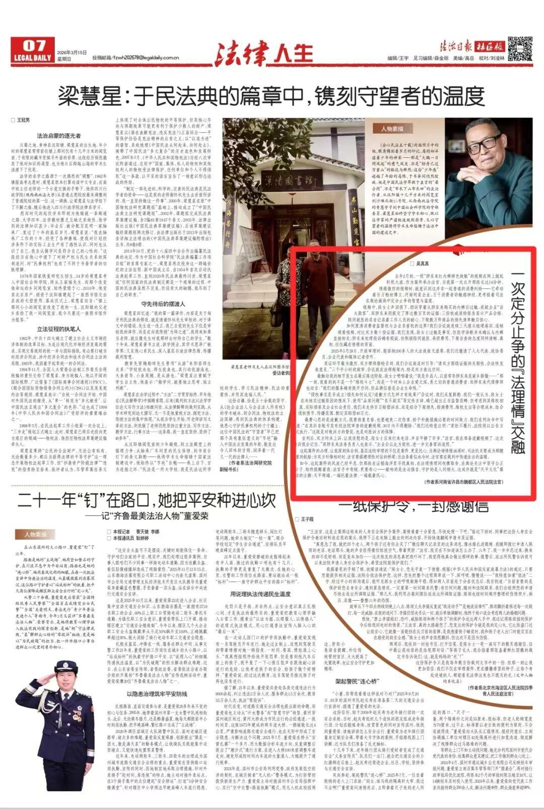 在此之前,《法治日報》于3月15日刊發(fā)《一次定分止爭的“法理情”交融》,以法官手記的形式講述該案辦理與庭審細節(jié)。
