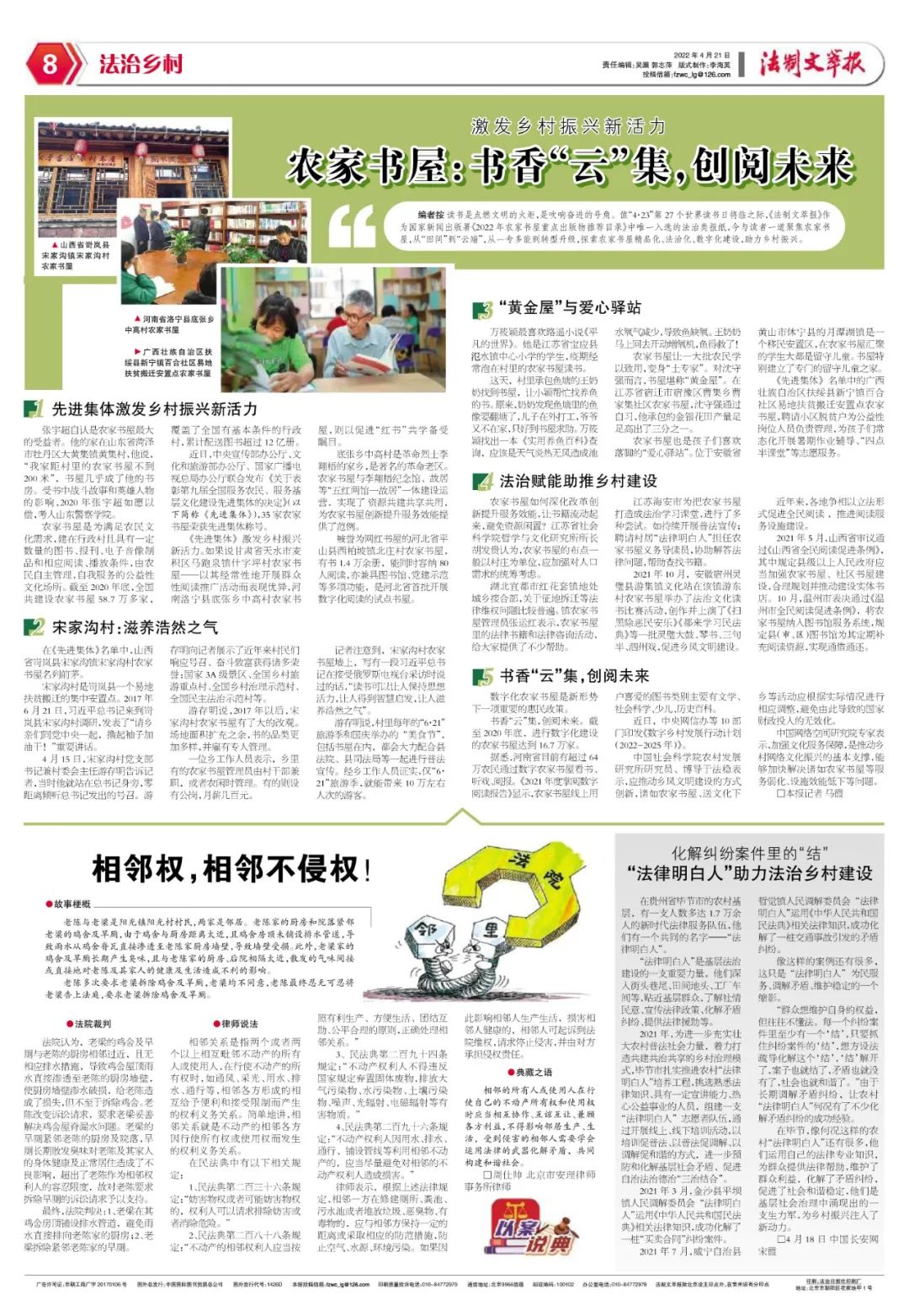 讀書是點(diǎn)燃文明的火炬,是吹響奮進(jìn)的號(hào)角。值“4·23”第27個(gè)世界讀書日將臨之際,《法制文萃報(bào)》作為國家新聞出版署《2022年農(nóng)家書屋重點(diǎn)出版物推薦目錄》中唯一入選的法治類報(bào)紙,今與讀者一道聚焦農(nóng)家書屋,從“田間”到“云端”,從一專多能到轉(zhuǎn)型升級(jí),探索農(nóng)家書屋精品化、法治化、數(shù)字化建設(shè),助力鄉(xiāng)村振興。