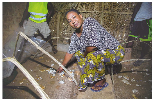 在中非共和國(guó)首都班吉附近的大馬拉地區(qū),盛夏7月的午后時(shí)分,太陽(yáng)熱辣,一間約6平方米、四壁用棕櫚葉遮陰的菇棚里卻幽暗清涼。棚內(nèi)有兩個(gè)長(zhǎng)2米、寬1米的畦床,其間星羅棋布地點(diǎn)綴著剛萌出的數(shù)十簇平菇。40歲的法蒂瑪蹲在土埂上,用手撥弄著飽滿的灰白色菌蓋,臉上難掩豐收的喜悅。