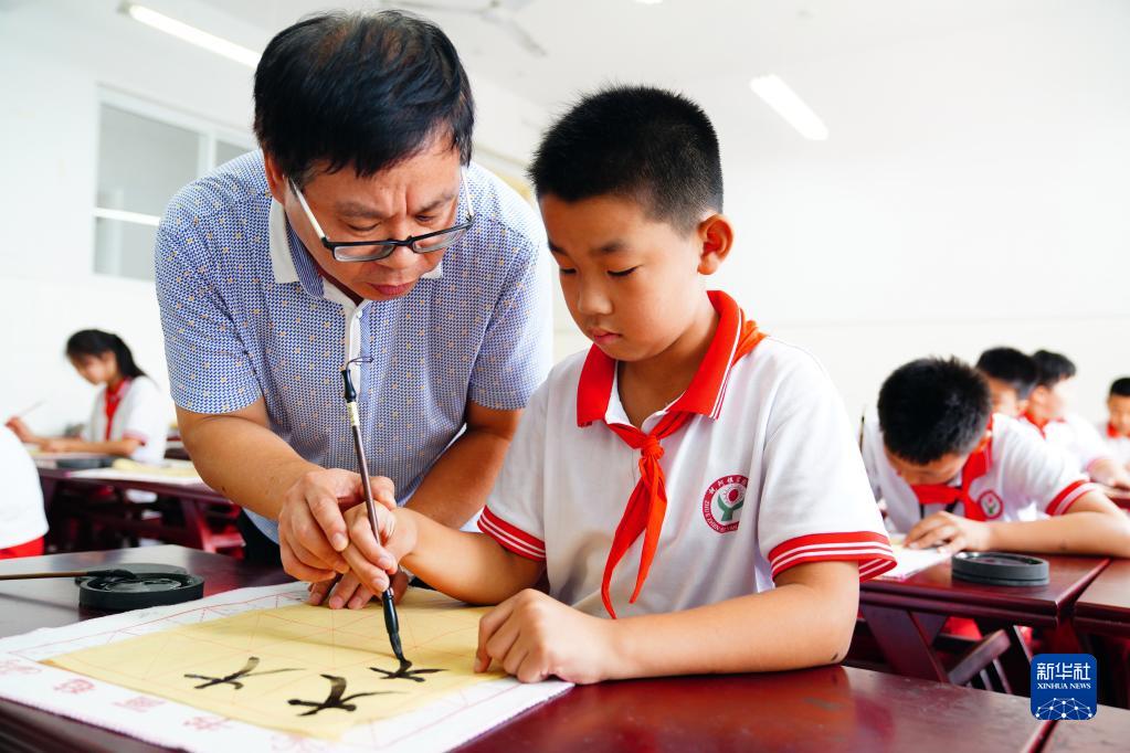 7月28日,在山東省齊河縣祝阿鎮(zhèn)馬坊社區(qū)鄉(xiāng)村“復(fù)興少年宮”,田偉在教小朋友練習(xí)書法。