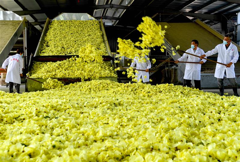 9月18日,在安徽省亳州市利辛縣王市鎮(zhèn)高寨村廣焱家庭農(nóng)場,村民在整理剛采收的黃蜀葵花。劉勤利攝