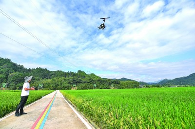在浙江省杭州市臨安區(qū)太陽鎮(zhèn)的稻田內(nèi),90后新農(nóng)人余岳峰操作農(nóng)用無人機在田間作業(yè)。 新華社發(fā)