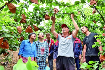 河北省邢臺市,“農(nóng)民助理技師”劉玉東(前)在梨園對工人進行技術(shù)指導(dǎo)。新華社發(fā)