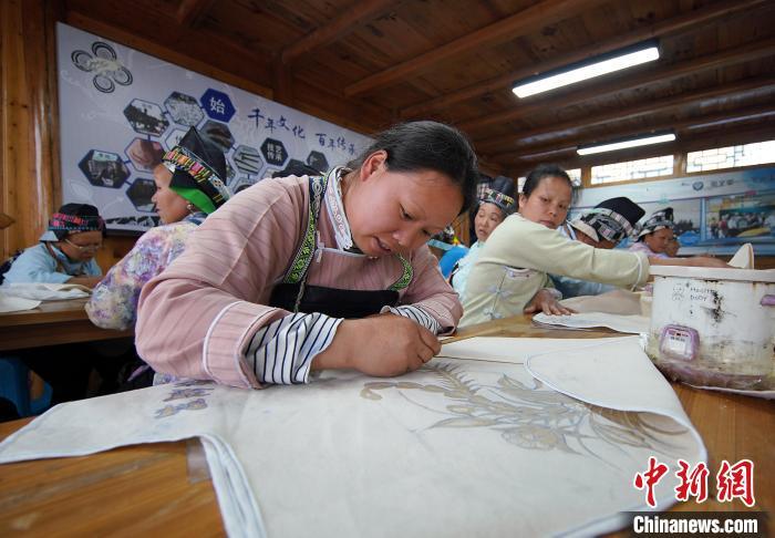 4月17日,在貴州丹寨縣龍泉鎮(zhèn)卡拉村蠟染工坊,苗族婦女在繪制蠟畫(huà)。黃曉海 攝