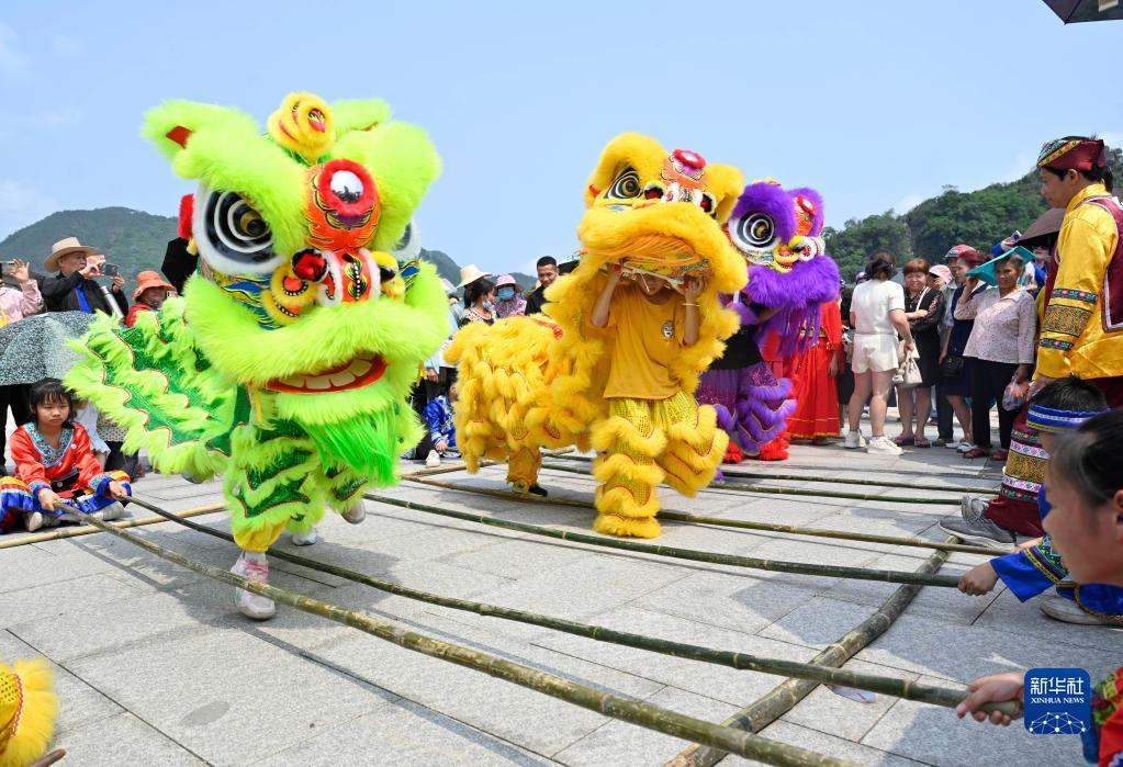 4月20日,在柳城縣鳳山鎮(zhèn)鳳鳴廣場(chǎng),舞獅藝人在跳竹竿舞。黎寒池 攝