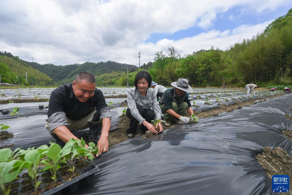 4月20日,返鄉(xiāng)創(chuàng)業(yè)人才俞冬紅(中)在位于臨安區(qū)昌化鎮(zhèn)后營村的蔬菜基地與農(nóng)戶交流。記者 徐昱 攝