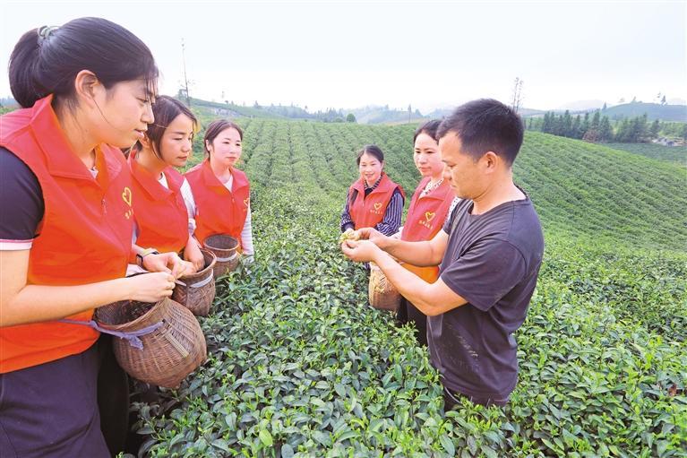 貴州省黎平縣產(chǎn)業(yè)帶頭人歐定珍(右一)為志愿者培訓(xùn)采茶技術(shù)。吳光輝 攝