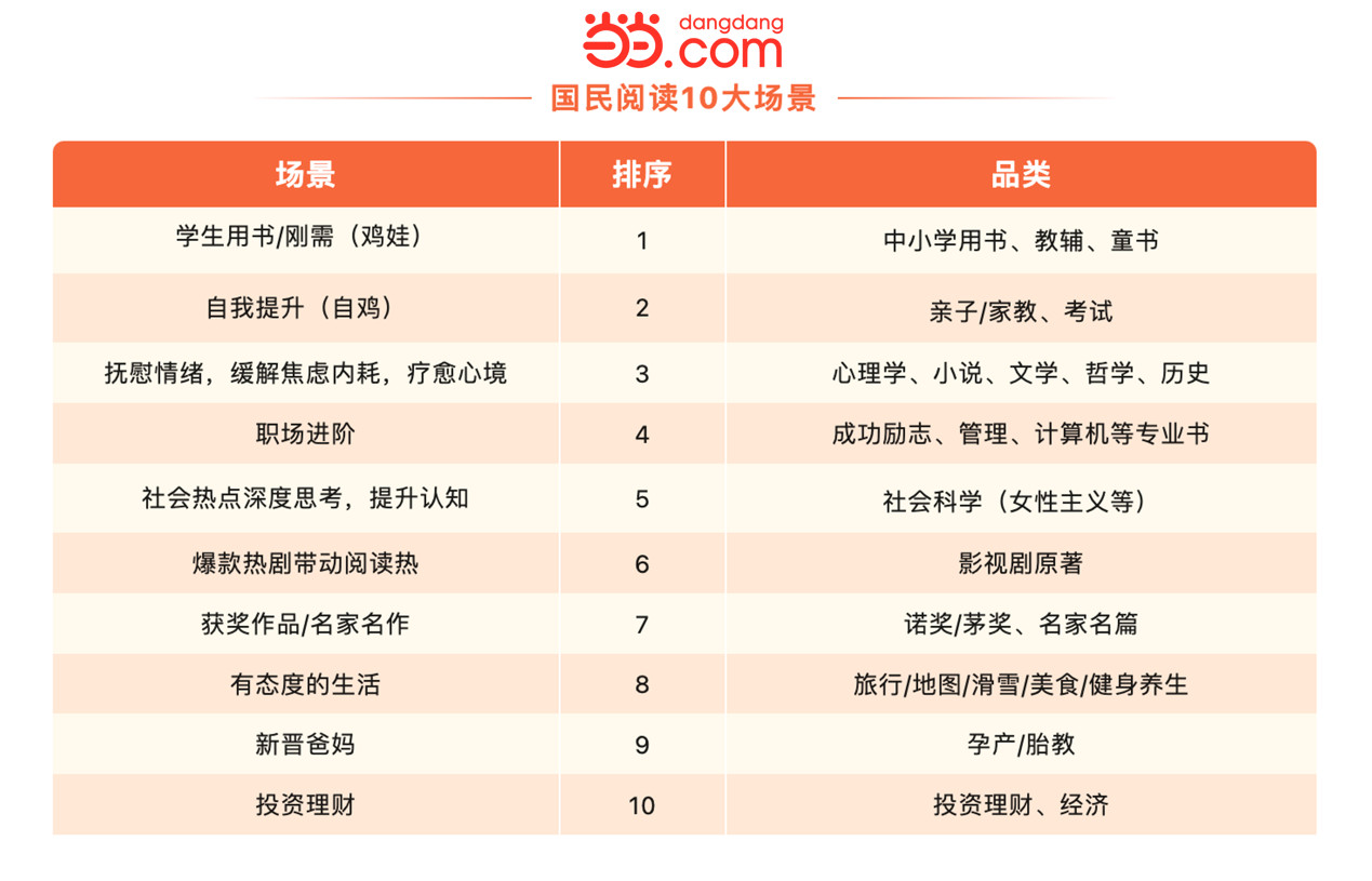 閱讀是大腦的有氧運動,卻自帶阻力。在現(xiàn)實生活中,想不起來閱讀,想起來閱讀不知道讀什么書,是當(dāng)下閱讀推廣面臨的主要問題。結(jié)合品類和爆款書的消費趨勢,當(dāng)當(dāng)網(wǎng)發(fā)布“國民閱讀10大場景”,以期提醒更多讀者想起閱讀,想起書。