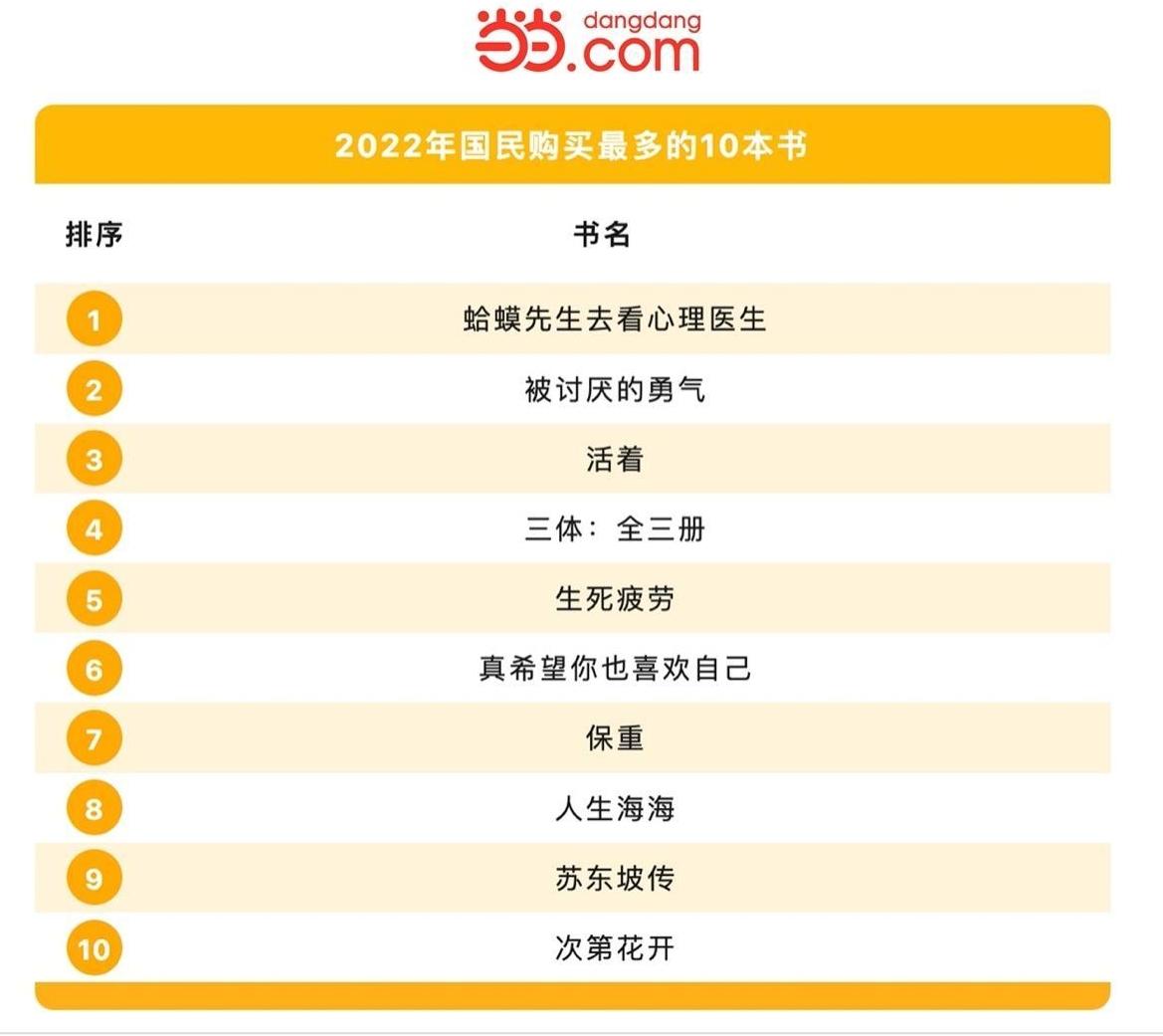 2022年國民購買最多的10本書中,心理學(xué)、療愈類、成功勵志、嚴(yán)肅文學(xué)、科幻書籍霸榜。邊躺邊卷是年度閱讀主題,一方面讀者通過自助心理類,心靈療愈類、嚴(yán)肅文學(xué)類書籍對抗精神內(nèi)耗,尋求自洽;一方面又通過成功勵志類、科幻類等書籍尋求積極、振奮的心態(tài)。
