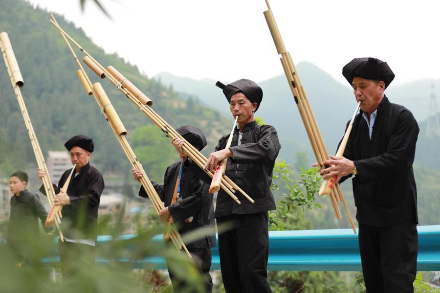 4月22日,苗族群眾在新民村吹蘆笙。