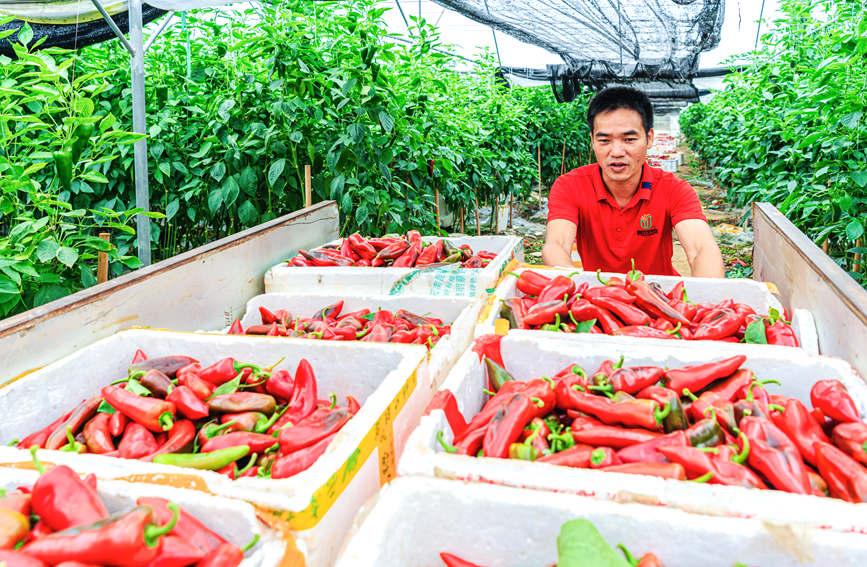 時下,廣西壯族自治區(qū)合浦縣常樂鎮(zhèn)西城村的140多畝的彩椒產(chǎn)業(yè)基地迎來豐收,紅燦燦的彩椒掛滿枝頭,數(shù)十名工人來回穿梭進(jìn)行采摘、搬運、裝車再運送到收集點,一派繁忙景象。