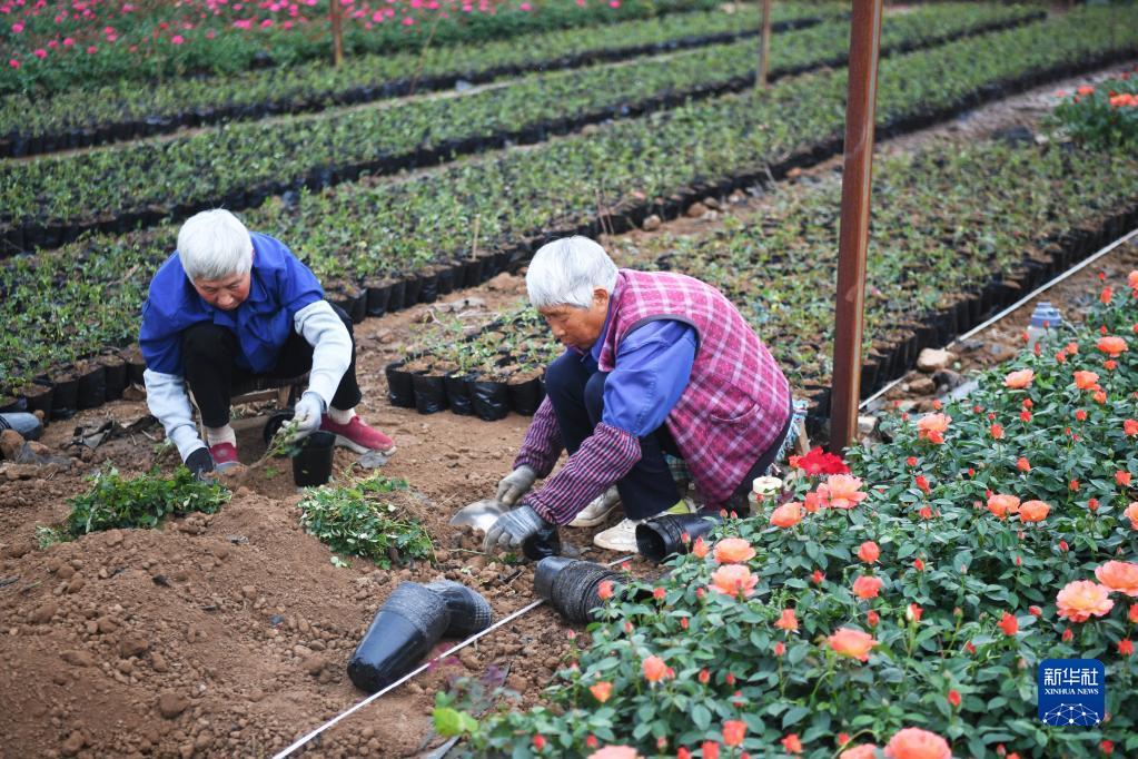 5月7日,工作人員在河南省南陽(yáng)市臥龍區(qū)石橋鎮(zhèn)南陽(yáng)月季基地移栽月季苗。記者 張浩然 攝