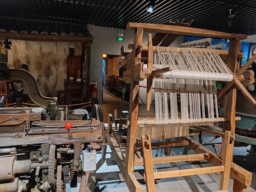 荷湖鄉(xiāng)土文化博物館里展示的手工織機和鄉(xiāng)鎮(zhèn)企業(yè)用過的紡織機器。記者 馮源 攝