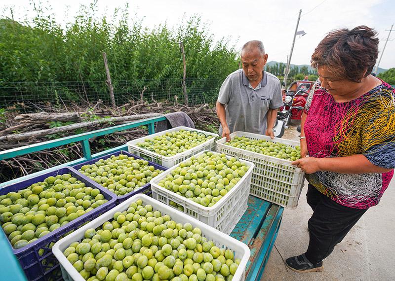 7月6日,山東省鄒平市西董街道南洞村的青李聯(lián)合農(nóng)場(chǎng),果農(nóng)整理采摘的青李。