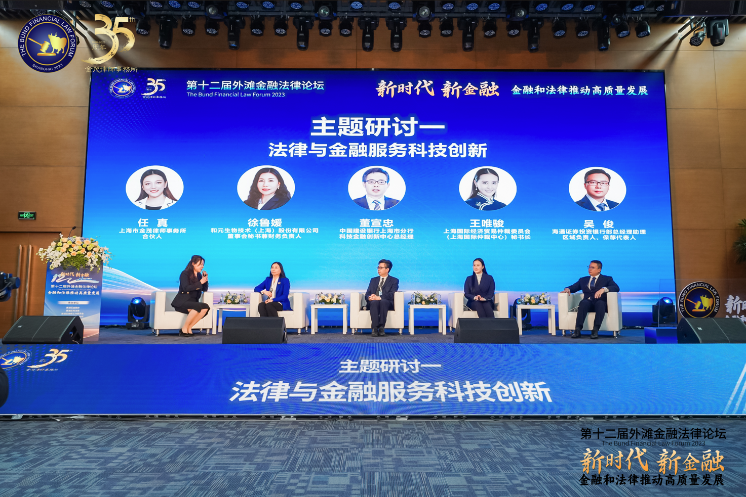 “法律與金融服務(wù)科技創(chuàng)新”主題研討環(huán)節(jié),由上海市金茂律師事務(wù)所合伙人任真律師主持,來自海通證券股份有限公司上海投資銀行部總經(jīng)理助理吳俊先生、上海國際經(jīng)濟(jì)貿(mào)易仲裁委員會(上海國際仲裁中心)秘書長王唯駿女士、中國建設(shè)銀行上海市分行科技金融創(chuàng)新中心總經(jīng)理董宣忠先生、和元生物技術(shù)(上海)股份有限公司董事會秘書兼財務(wù)負(fù)責(zé)人徐魯媛女士共同參與研討。