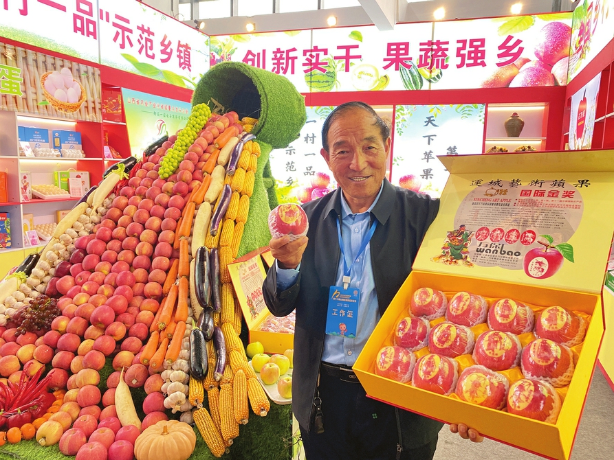 社長王萬保在展示合作社文化藝術蘋果 張新征 攝