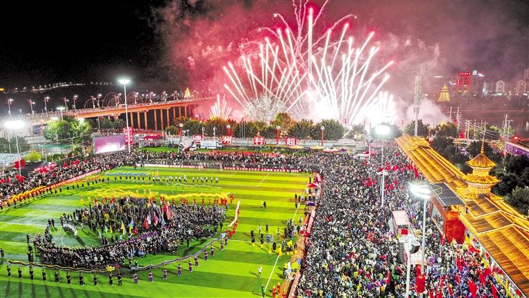 19時30分,澳門職工聯(lián)隊與貴州村超聯(lián)隊友誼賽結(jié)束后,“村超村晚”文藝展示又將整場活動推向高潮。這場晚會由民風(fēng)民俗展新顏、鄉(xiāng)村足球超快樂、貴山貴水迎貴客、龍騰盛世慶豐年4個篇章組成,參演演員近2300人。據(jù)相關(guān)負(fù)責(zé)人介紹,此次文藝展示的內(nèi)容均以榕江“村超”自創(chuàng)節(jié)目為主,同時,澳門舞醉龍表演隊在龍騰盛世慶豐收環(huán)節(jié)與貴州的舞龍隊伍共同演出,展示出兩地文化的互通互融。本次文藝展示強調(diào)“草根”和民族文化,吸引了上萬人現(xiàn)場觀看,在演出的尾聲,一場持續(xù)10余分鐘的煙花秀點亮了榕江縣的夜空,“文化味、民族味、傳承味、年味”十足的“村超村晚”在觀眾和游客的掌聲與歡呼聲中落下帷幕。
