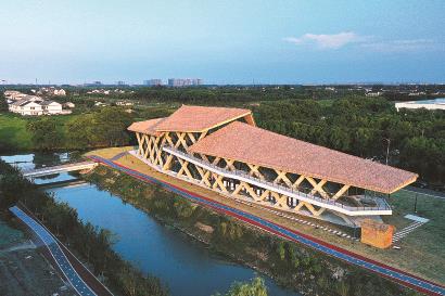 奉賢南橋“鄉(xiāng)村最美水岸會客廳”披著金色霞光置身綠野 記者 李茂君 攝
