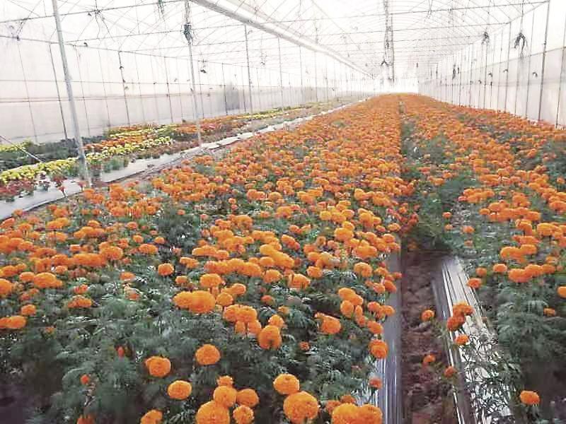在農(nóng)安縣三盛玉鎮(zhèn)三盛玉村的花卉大棚內(nèi),滿是準(zhǔn)備移栽的萬壽菊(資料圖片)