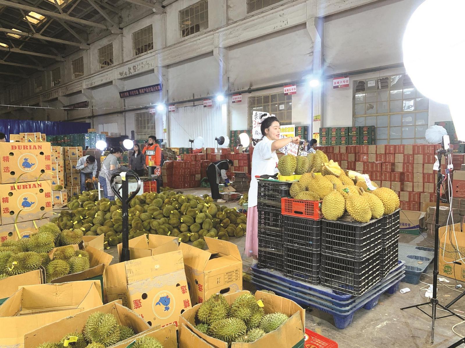 5月初的一個上午,記者在云南思珺兒生鮮供應鏈基地看到,一筐筐沃柑、藍莓、人參果,以及從泰國運來的榴蓮、山竹堆滿了倉庫,散發(fā)出濃濃果香。而在卸貨區(qū)的另一側,分出了眾多直播區(qū),在兩盞燈、幾部手機前,一位主播正情緒飽滿地向屏幕前的粉絲介紹果品、釋疑解惑,一個個直播的小天地外,選果、打包更是一派繁忙景象。