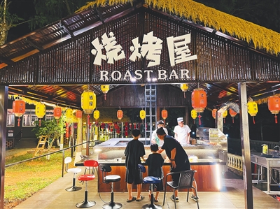 近日,游客在才存共享農(nóng)莊內(nèi)的鄉(xiāng)村酒吧街消費 記者 高懿 攝