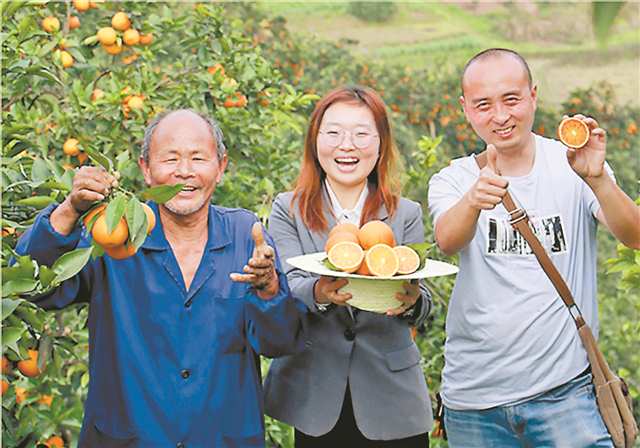 游莉(中)和村民一起直播,吆喝墊江的優(yōu)質(zhì)柑橘(受訪者供圖)