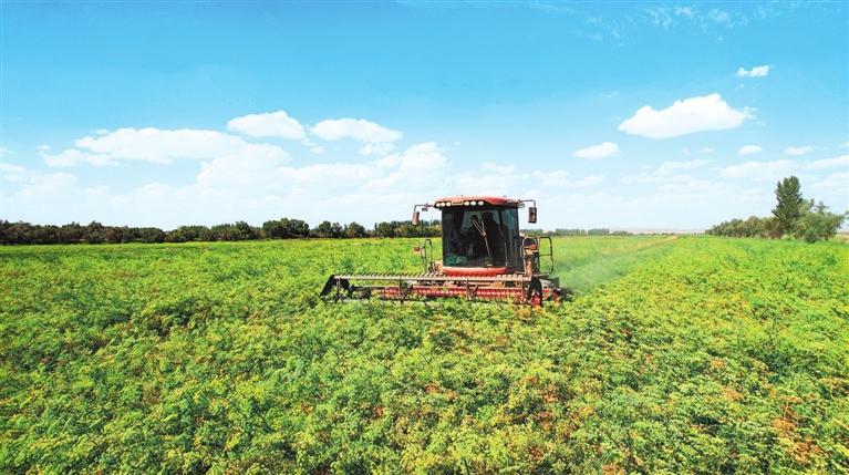 但見地里的苜蓿有高有低、呈波浪狀?!澳闱?,我們農(nóng)場進行植株高低搭配,將個頭較高的WJ363HK苜蓿與個頭低的阿蒂娜間作套種,當苜蓿大面積開花時,能充分享受陽光,提高苜蓿牧草的粗蛋白含量?!壁w富強說著算了一筆賬:今年6月10日到20日,頭茬苜蓿成熟,19臺大型機械搶趕時間,一個多星期就收割結(jié)束,保障了粗蛋白含量高達20%以上;目前第二茬苜蓿只有40厘米高,長到7月下旬80厘米左右即可收割;第三茬苜蓿到9月中下旬時收割。1畝苜蓿收割3茬、可產(chǎn)900公斤至1噸干草,按照目前市場價1噸干草1600至1800元計算,收益可觀。