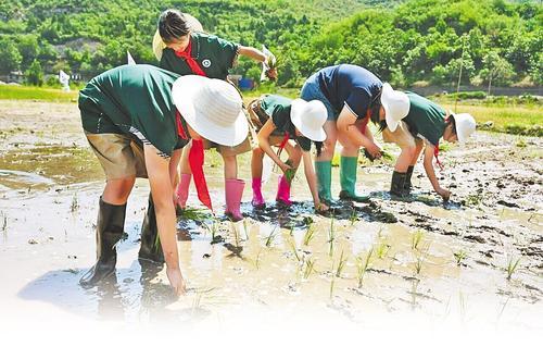 7月20日,井陘縣南峪村,參加農(nóng)耕研學(xué)活動(dòng)的學(xué)生正在稻田插秧 記者 張曉超 攝