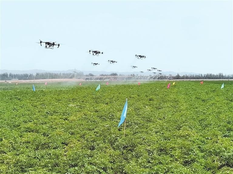 永昌縣聯(lián)聯(lián)眾力農(nóng)機(jī)農(nóng)民專(zhuān)業(yè)合作社正在進(jìn)行無(wú)人機(jī)飛防作業(yè) 記者 馬國(guó)順