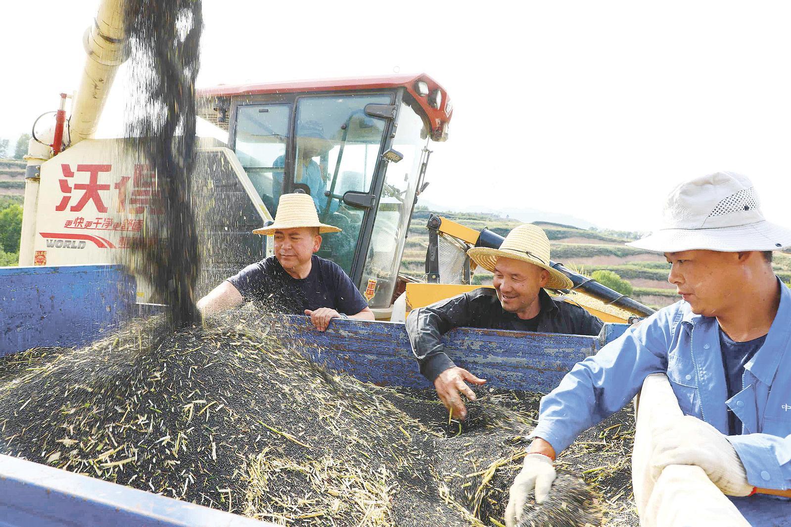 在一處坡洼的田塊里,一臺聯(lián)合收割機(jī)正在卸糧,收獲的油菜籽從卸糧口傾瀉而下,倒入三輪車斗里?!斑@塊田以前是撂荒地,我們合作社流轉(zhuǎn)后種植了油菜。今年雨水好,看莊稼長勢,油菜籽畝均產(chǎn)量至少在150公斤以上?!睆埣仪f村黨支部書記張斌先和村支部委員寧智祥捧起一把黑黝黝的油菜籽,臉上露出收獲的喜悅。