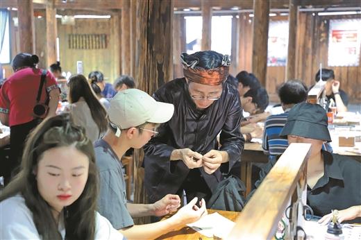 當(dāng)下,“非遺+旅游”成了苗寨文旅融合發(fā)展的新熱點(diǎn)。當(dāng)?shù)匾劳蟹沁z資源優(yōu)勢(shì),圍繞蠟染、刺繡、銀飾等非遺文化,推出非遺研學(xué)體驗(yàn)文旅項(xiàng)目,吸引了大批游客前來。