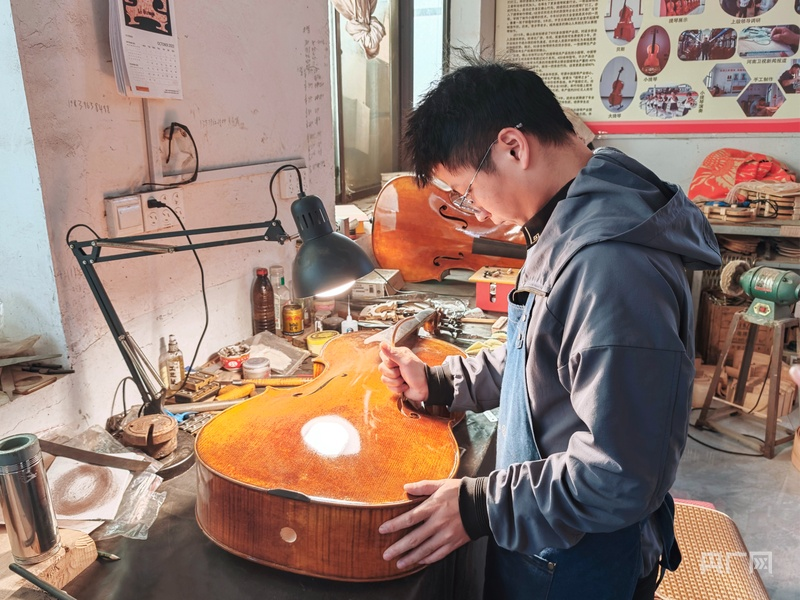 確山縣手工提琴制作協(xié)會會長王金堂見證了家鄉(xiāng)提琴產(chǎn)業(yè)從無到有、從弱到強的全過程。2015年,他率先返鄉(xiāng)創(chuàng)立河南省金鳴樂器股份有限公司,并帶領(lǐng)一批制琴師回到確山創(chuàng)業(yè)。他們通過改進工藝、研發(fā)新品,將確山提琴打造成國際高端市場的寵兒。王金堂介紹,他的一把定制手工提琴曾以20萬美元的價格賣出。