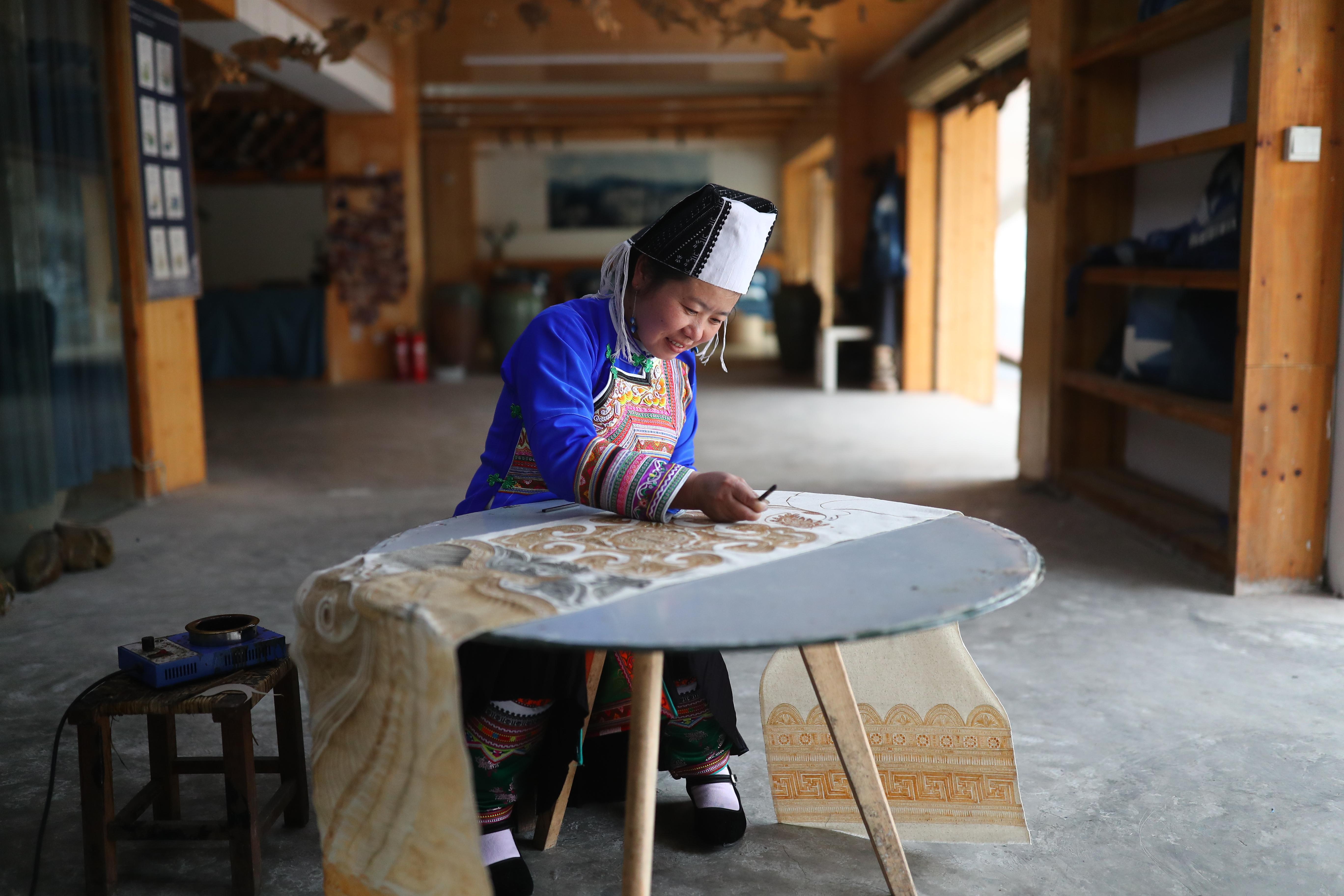 在貴州省榕江縣,苗族蠟染刺繡傳承人在非遺工坊制作蠟染作品 記者 盧旭 攝