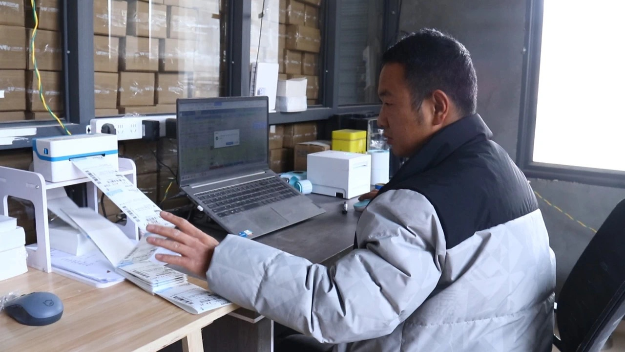 岷縣岷歸人家電子商務有限責任公司負責人李智軍正在打印訂單(岷縣融媒體中心供圖)