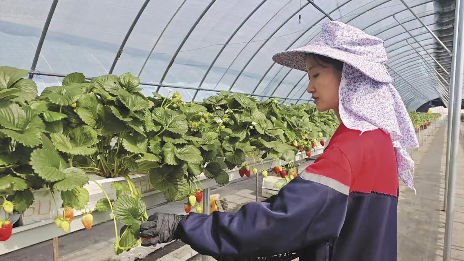 技術(shù)員正在采摘草莓。記者 羅珺 攝