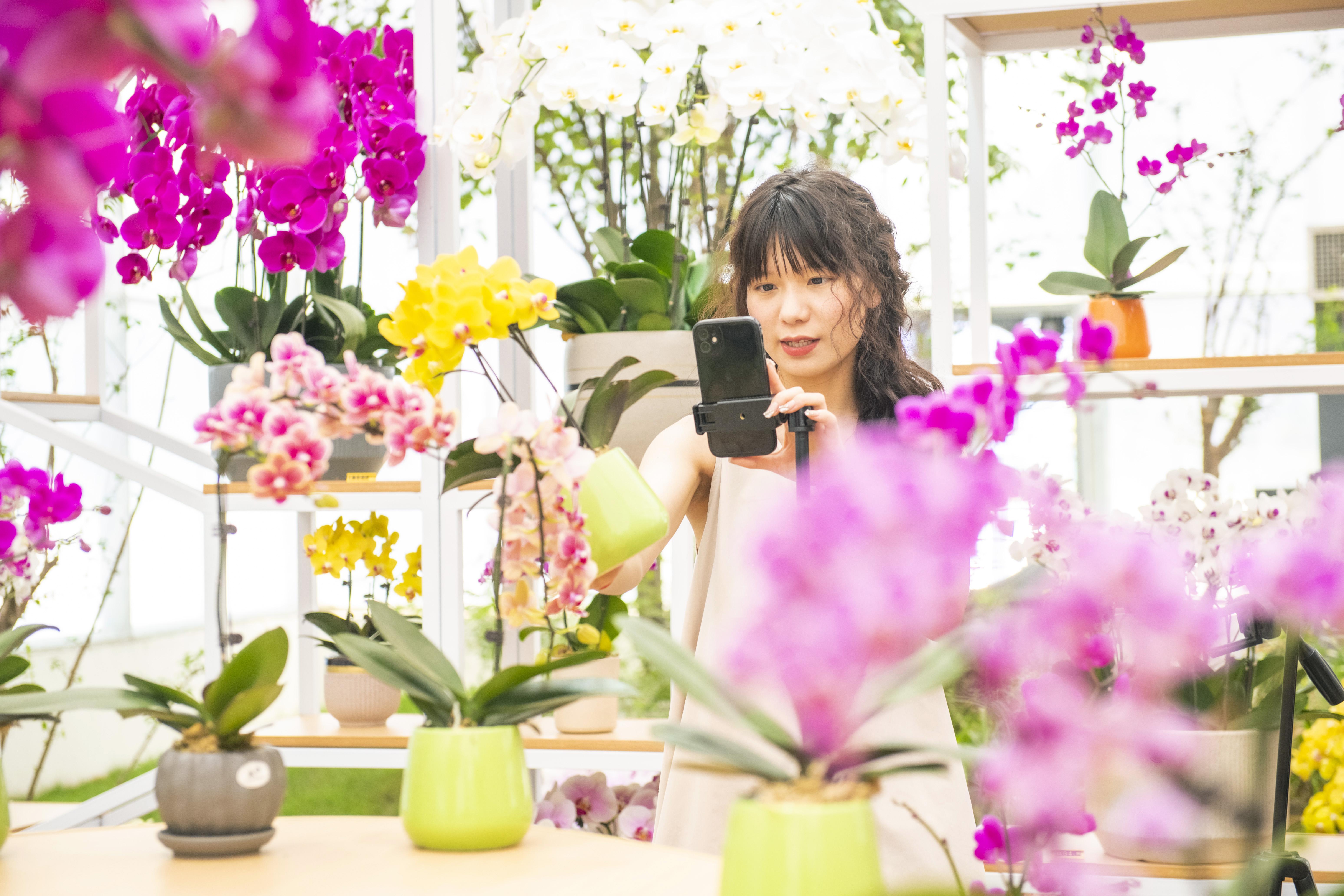 工作人員在蝴蝶蘭大世界直播