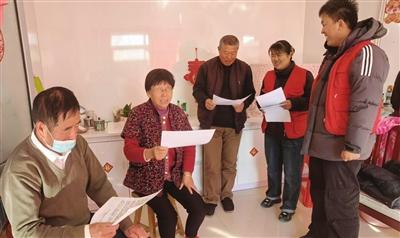 大辛村村干部上門宣傳《村規(guī)民約》。照片由寧河融媒體提供