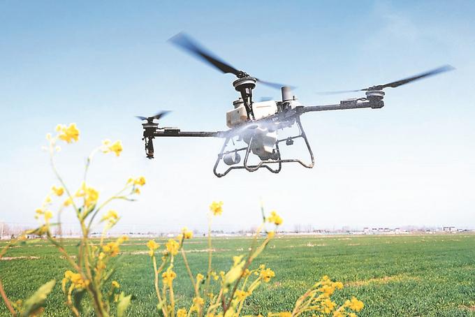 在省農(nóng)墾三河農(nóng)場(chǎng)邱上營(yíng)分場(chǎng)的麥田里,植保無(wú)人機(jī)進(jìn)行飛防作業(yè)。顏懷峰 錢(qián)厚紅 攝