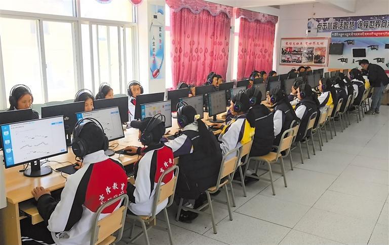 在日喀則市吉隆縣中學新機房內(nèi),學生們頭戴耳機跟隨教師指令進行實操訓練。