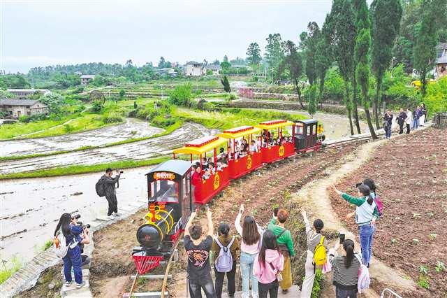 4月25日,綦江區(qū)古南街道花壩村,游客乘坐田園小火車(chē)。記者 龍帆 攝