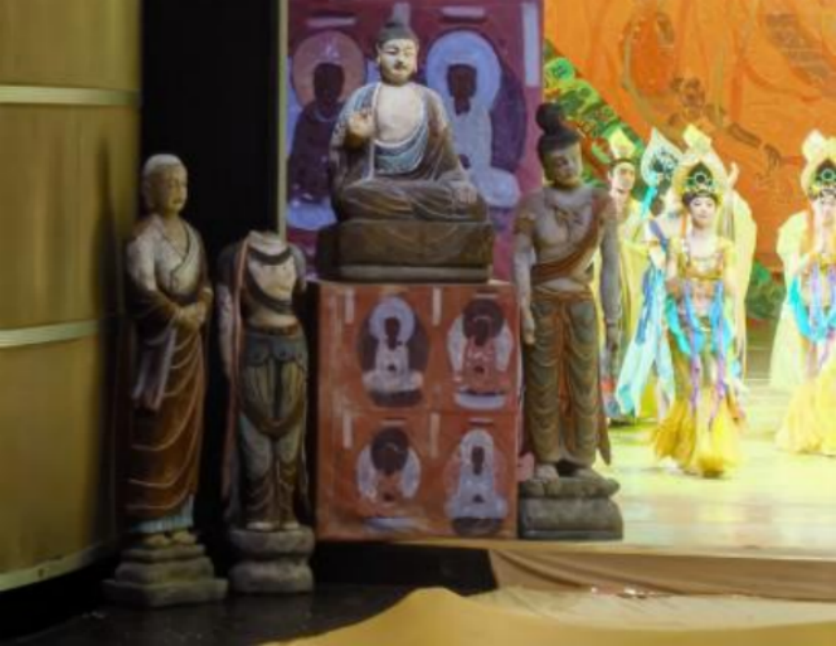 《大夢敦煌》由蘭州歌舞劇院創(chuàng)排,于2000年在京首演,可謂占盡天時地利人和。當其時,上有2019年中央領(lǐng)導(dǎo)視察莫高窟,有力推動敦煌文化研究服務(wù)共建“一帶一路”決策;前有甘肅省歌舞劇院于1979年創(chuàng)作的“中國舞劇的里程碑”——舞劇《絲路花語》作標桿;后有地方政府大力支持,集一流的制作班底于一身,想不出彩兒都難。