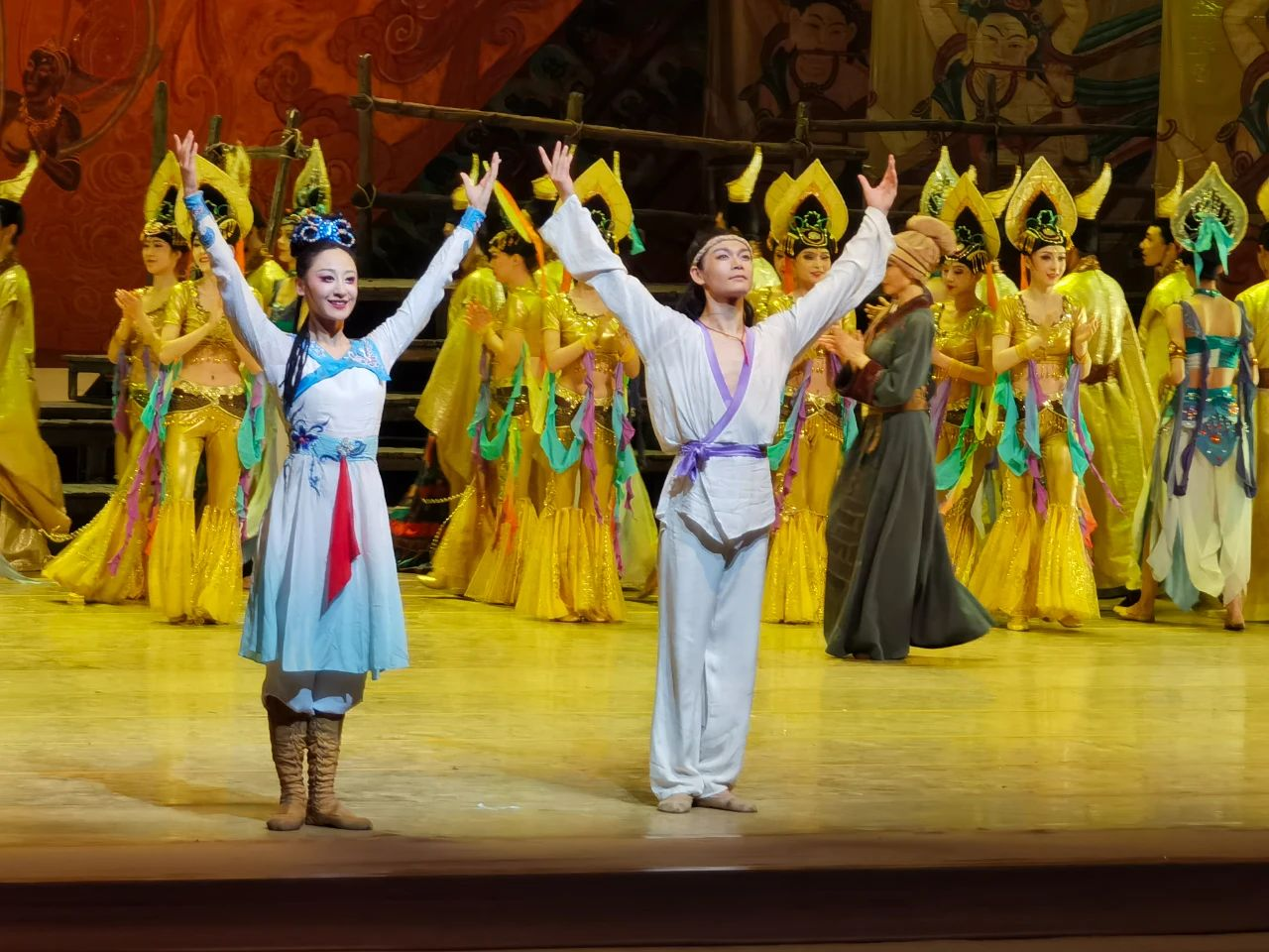 舞劇《大夢敦煌》謝幕時分。劇中李祎然(左)、高萬鑫的雙人舞,至情至誠充滿張力,令人動容。馬霞 攝